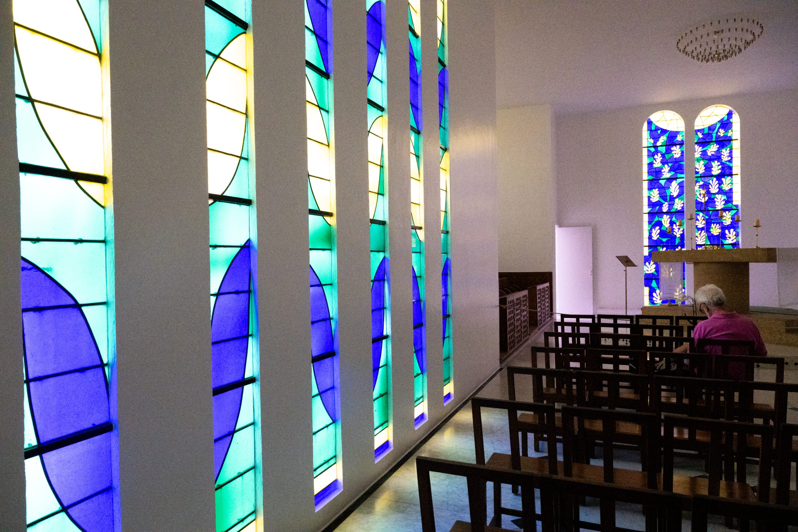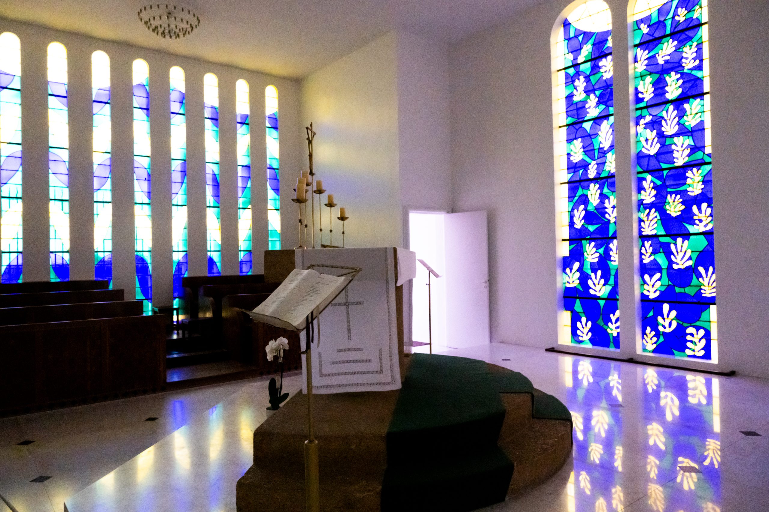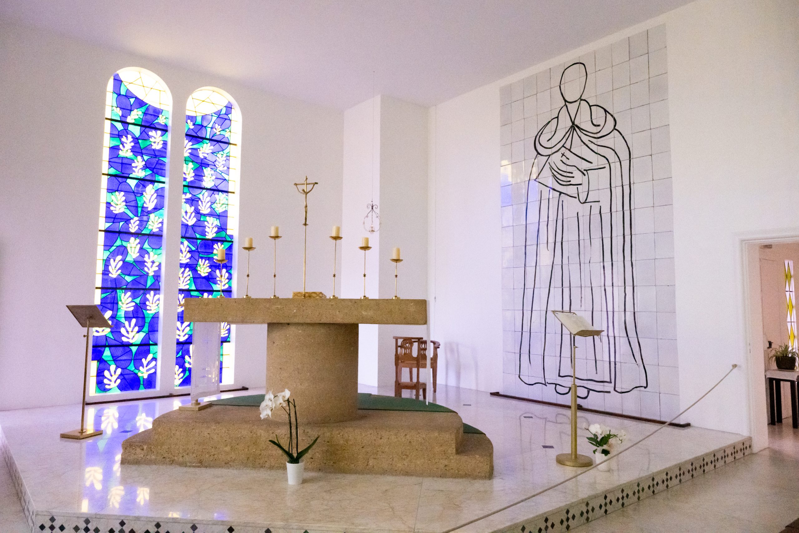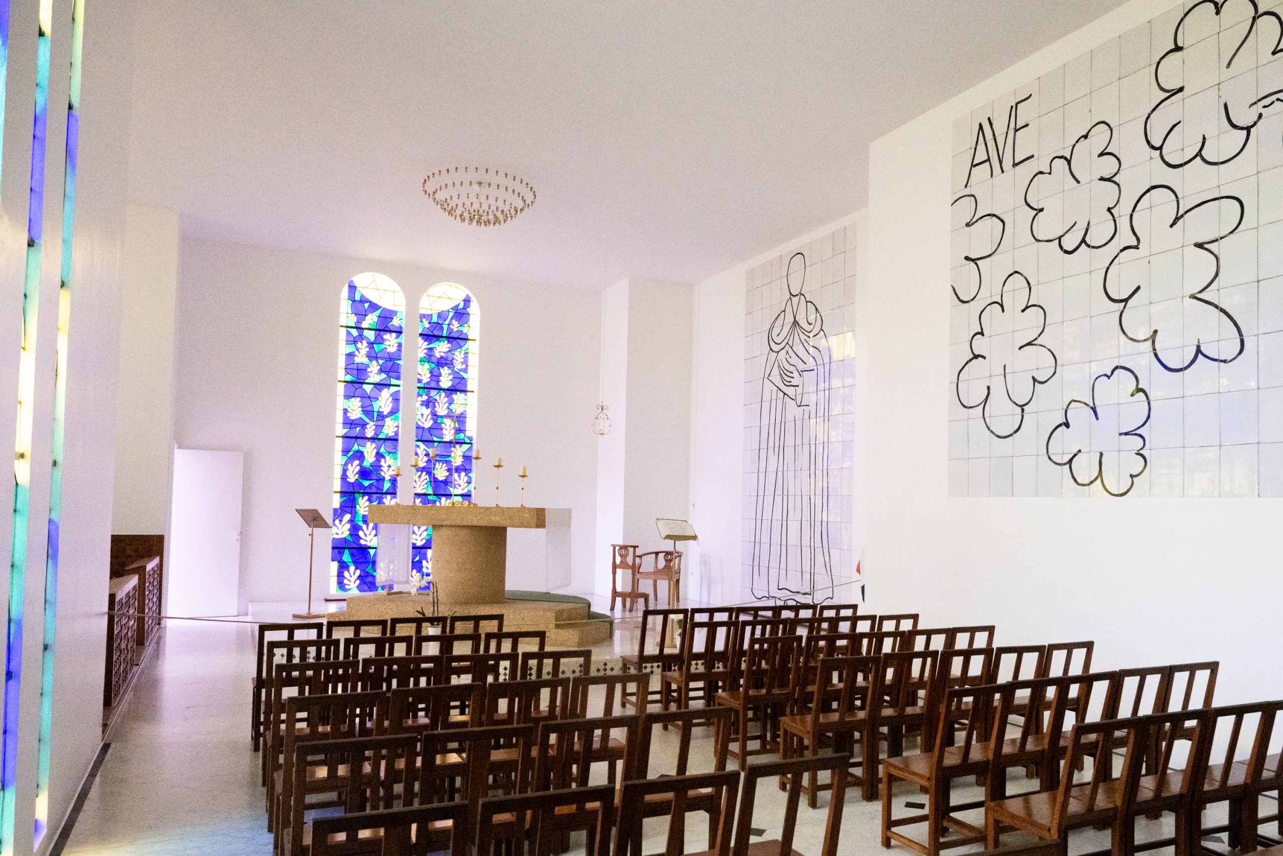 - Какво да видите: витражи (синьо/жълто/зелено), „Пътят на Кръста“, стенописи върху бели керамични плочи, литургични одежди по дизайн на Матис.