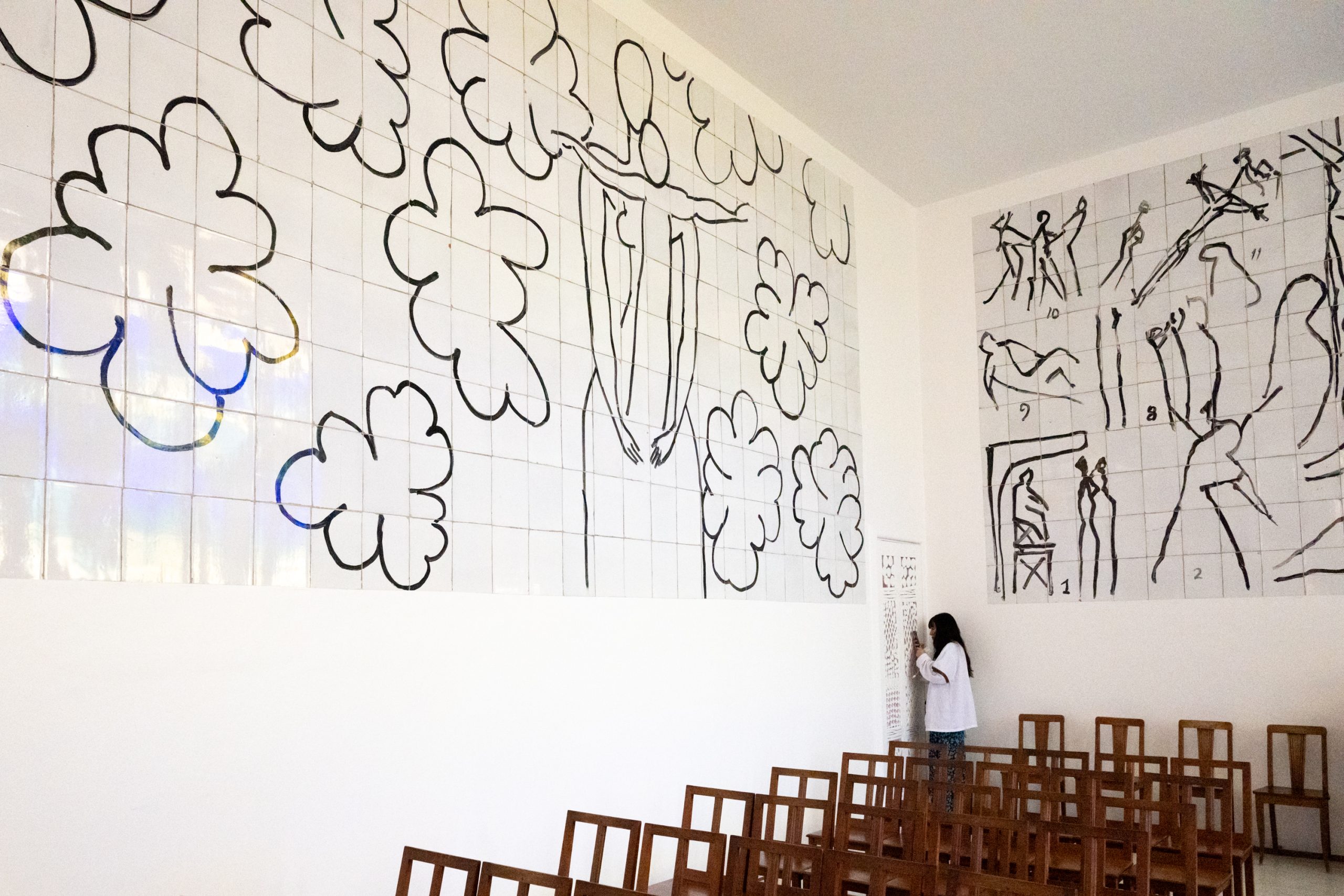 Работейки от инвалидна количка, Матис рисува големите линии с четка, закрепена за дълга пръчка. Той ограничава палитрата до три цвята – синьо, жълто и зелено – за да постигне простота, която да носи усещане за необятност. Витражите пропускат мека, пречистена светлина, която се разлива върху белите стени. Интериорът няма украса – само линии, цветове и светлина.