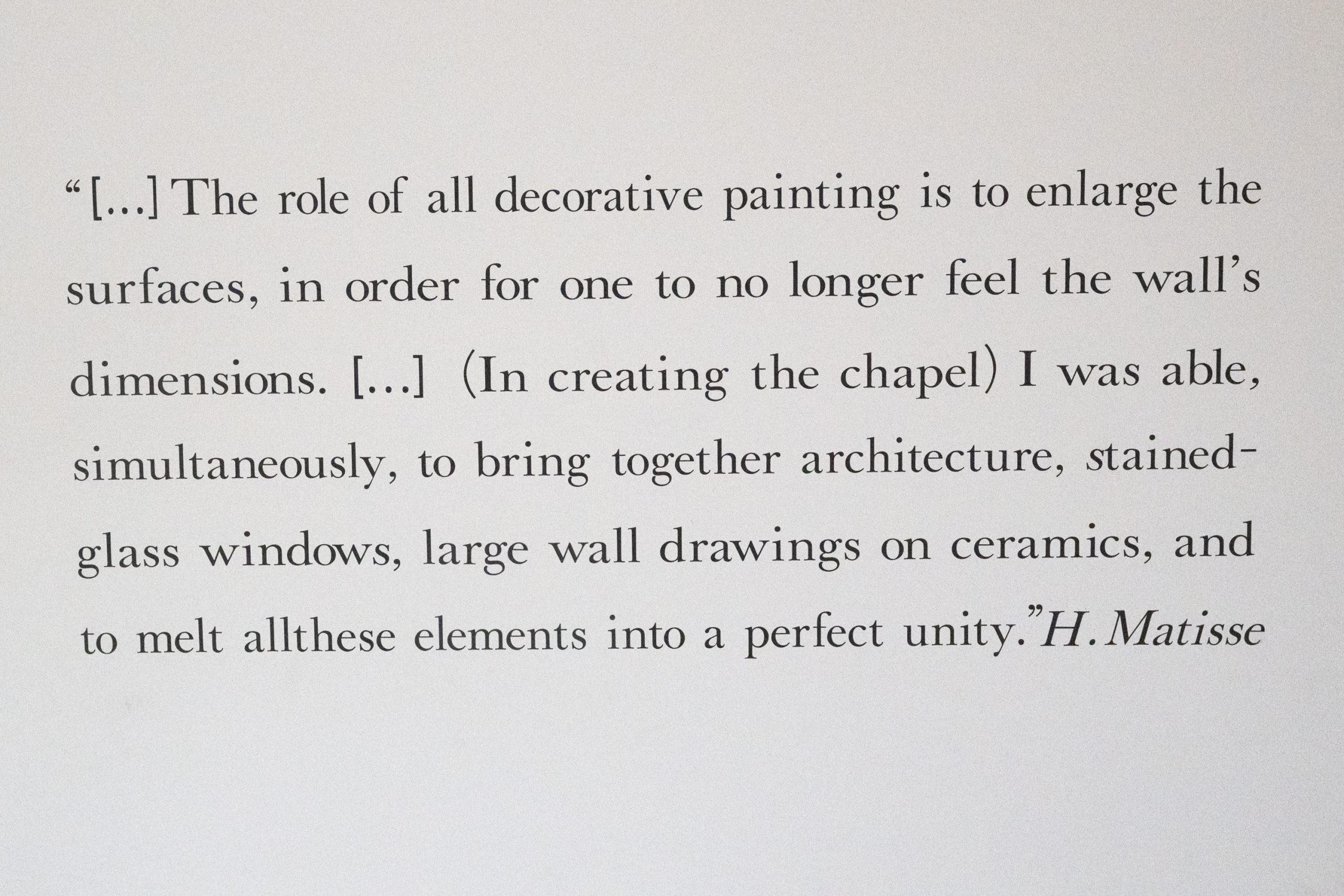 Вместо да украсява, Матис търси тишината. Черните контури върху белите керамични плочи изразяват духа на смирение. „Същественото е да се работи в състояние на духа, близко до молитвата,“ казва художникът. Така той достига до своята крайна форма – изкуство, което не изобразява, а просветлява.