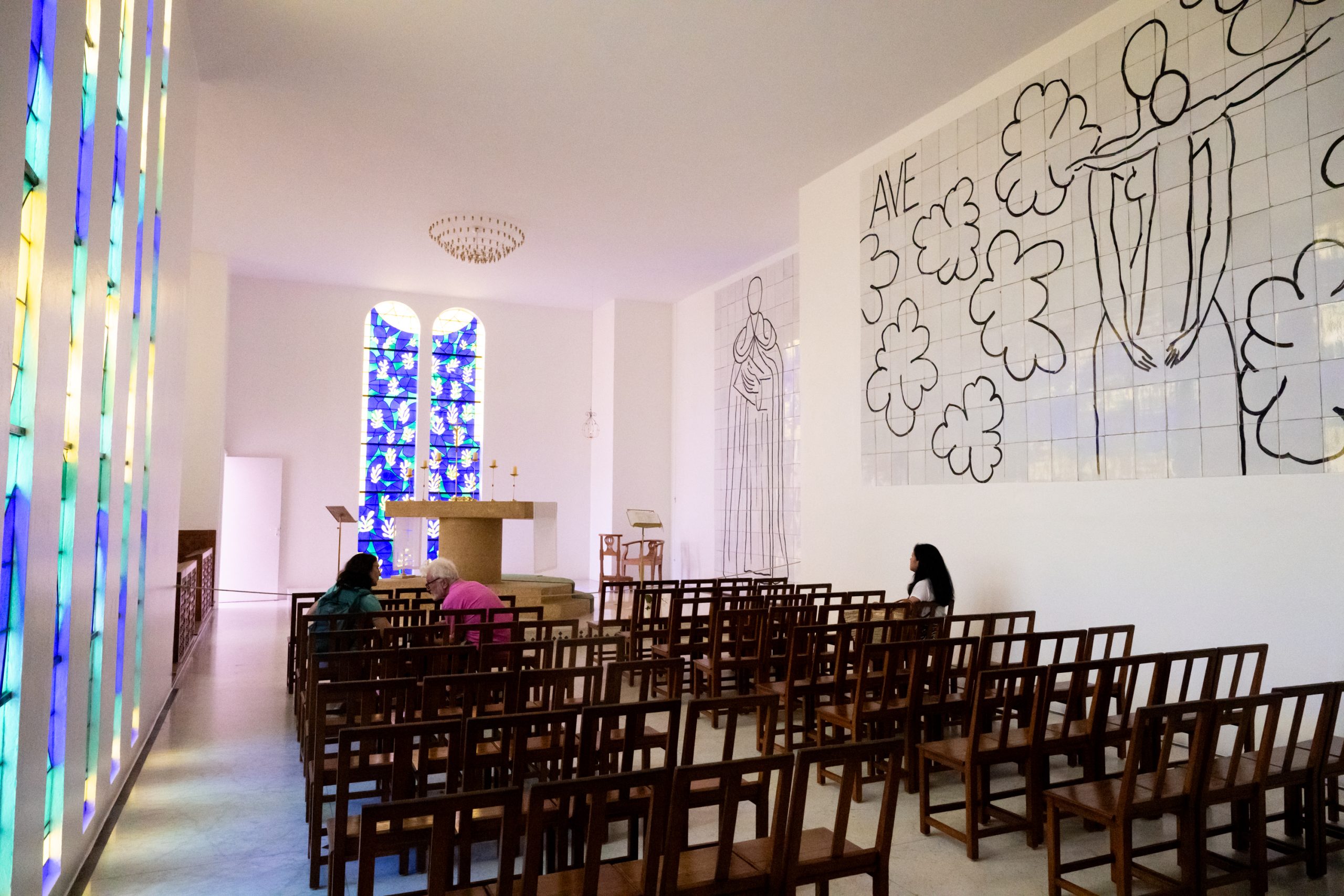 - Какво да видите: витражи (синьо/жълто/зелено), „Пътят на Кръста“, стенописи върху бели керамични плочи, литургични одежди по дизайн на Матис.