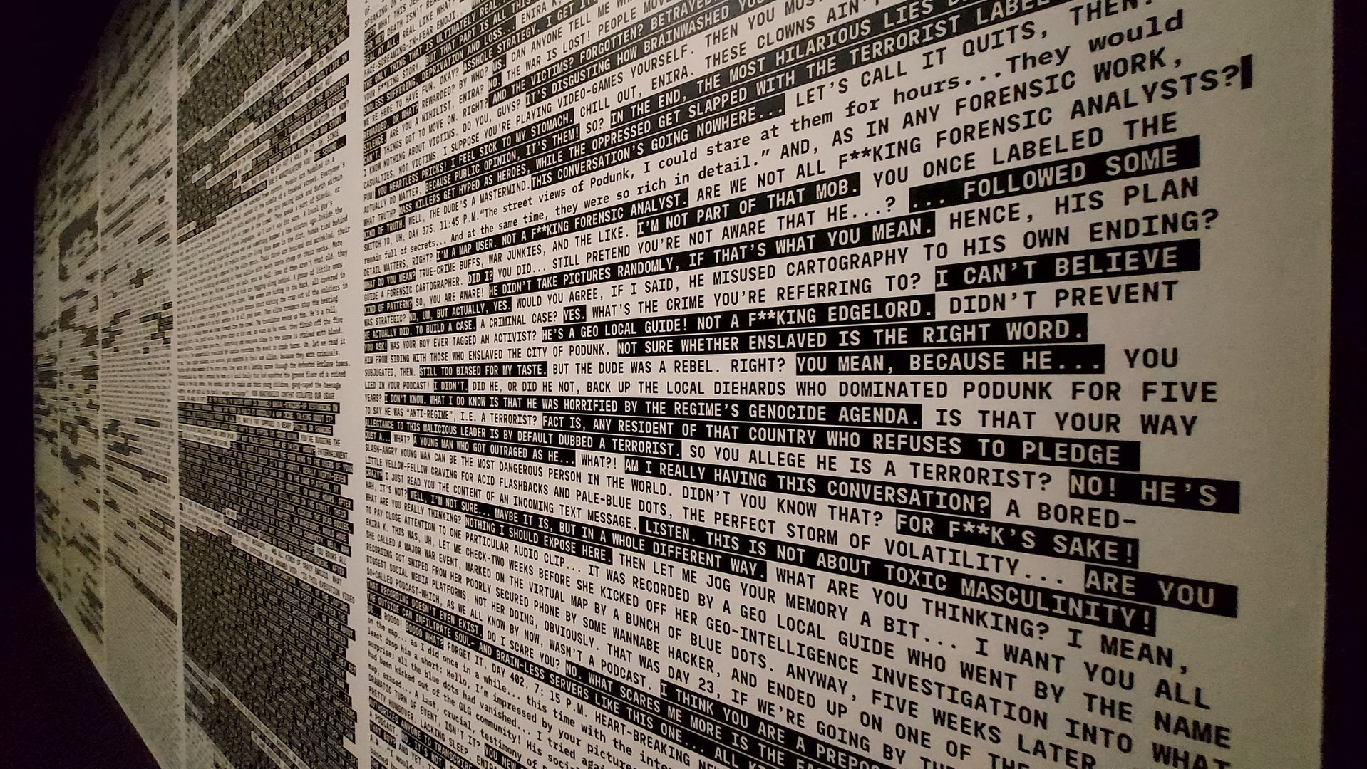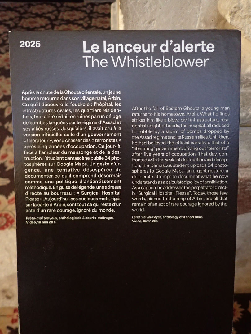 Проектирайки разследването си в диалог с пространството и хората, които го пресичат, Карин Креке поставя под въпрос релевантността на възприятието, когато сме изправени пред война и изображенията, които свидетелстват за нея. Изправена пред тези пренаредени видения, публиката се превръща в участник в произведението, внасяйки свои собствени преживявания, емоции и интерпретации. Изложбата е не просто разказ — тя е покана да преосмислим връзката си с информацията и образите във времена на конфликт.