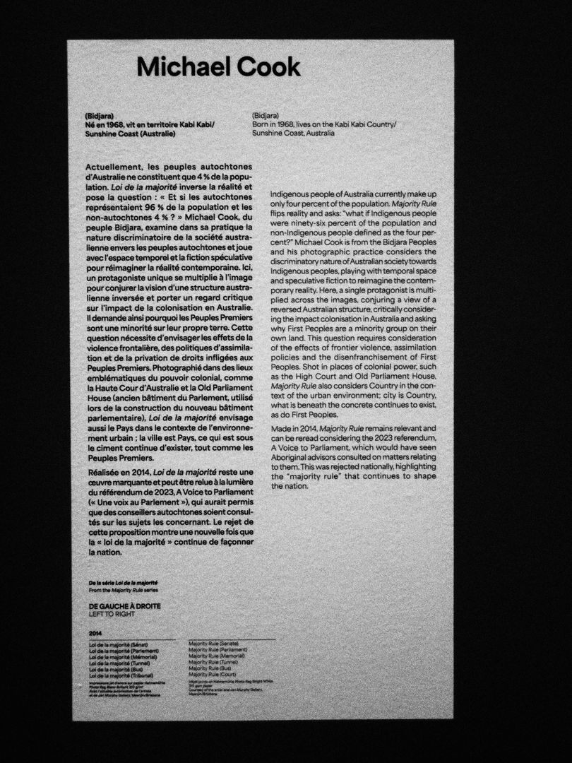 Коренните народи на Австралия днес съставляват едва четири процента от населението. Правило на мнозинството (Majority Rule) обръща реалността и задава въпроса: „А какво би станало, ако коренните народи бяха деветдесет и шест процента от населението, а некоренните – определени като четири процента?“ Майкъл Кук е от народа Биджара и неговата фотографска практика разглежда дискриминационната природа на австралийското общество към индигенните народи, като си играе с времето, пространството и спекулативната фикция, за да преразгледа съвременната реалност. Тук един-единствен протагонист е умножен във всички изображения, създавайки поглед към обърната структура на Австралия и критично осмисляйки въздействието на колонизацията, поставяйки въпроса защо Първите народи са малцинство на собствената си земя.