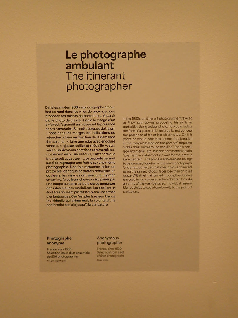 През 30-те години на XX век един обикалящ фотограф посещава провинциални градове, предлагайки портретни услуги. С помощта на класова снимка той изолира лицето на избрано дете, уголемява го и скрива съучениците му. На пробното копие отбелязва инструкции по желание на родителите („добавете рокля с кръгло деколте“, „добавете колие и медальон“), както и търговски бележки („плащане на вноски“, „изчакайте одобрение на проекта“). Същите техники позволяват и групиране на братя и сестри в една снимка.
