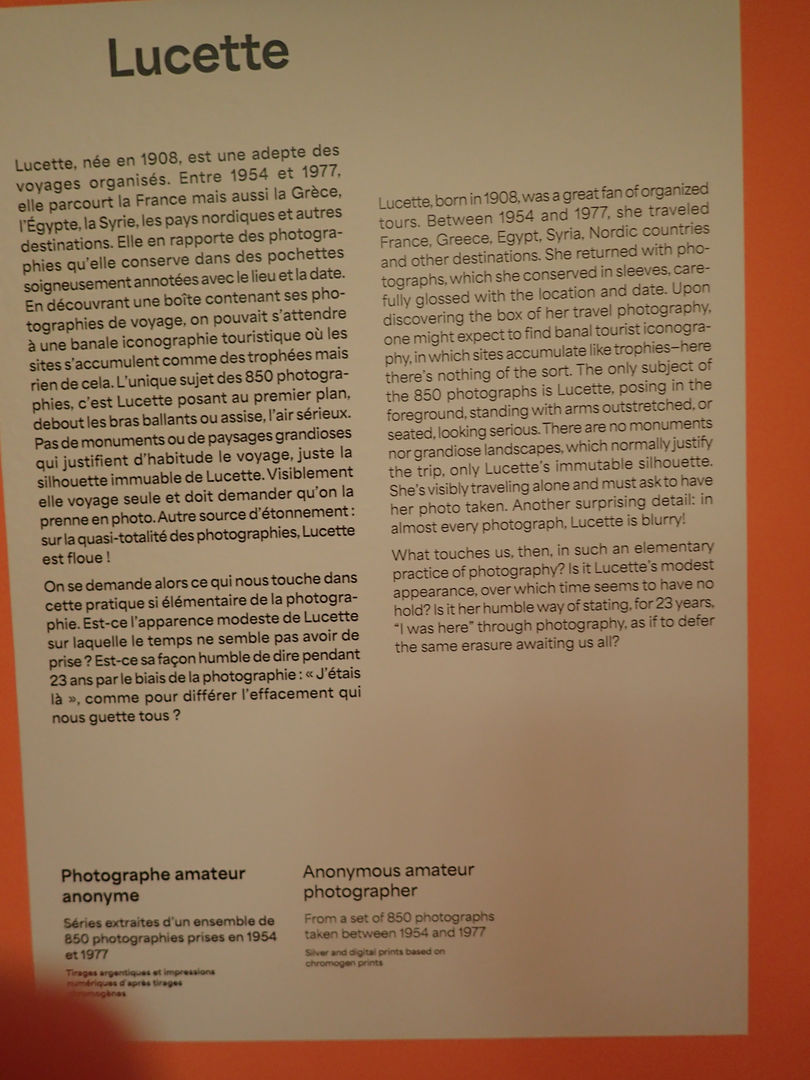 Люсет, родена през 1908 г., е голям фен на организираните екскурзии. Между 1954 и 1977 г. тя пътува из Франция, Гърция, Египет, Сирия, скандинавските страни и други места. Връща се с фотографии, които съхранява в пликове, старателно надписани с местоположението и датата.