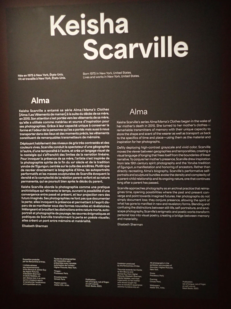 Серията „Alma/Mama’s Clothes“ на Кейша Скарвил започва след смъртта на майка ѝ през 2015 г. Тя се обръща към дрехите на майка си — забележителни носители на памет със своята уникална способност да пазят формата и аромата на човека, който ги е носил, както и да ни пренасят обратно към конкретни моменти и места — използвайки ги като материал и вдъхновение за своите фотографии.