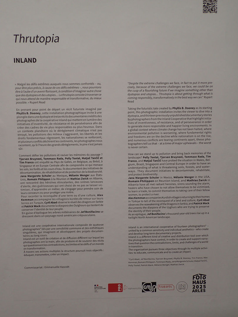 Изхождайки от футуристичния разказ, създаден от Филис Б. Дуни, тази фотографска инсталация кани зрителя да се потопи в дистопия, към която се добавят тринадесет непубликувани досега документални истории на фотографи от кооператива INLAND. Те представят инициативи на изобретателност, съпротива и постоянство — за създаване на по-отговорни и по-щастливи условия на живот.